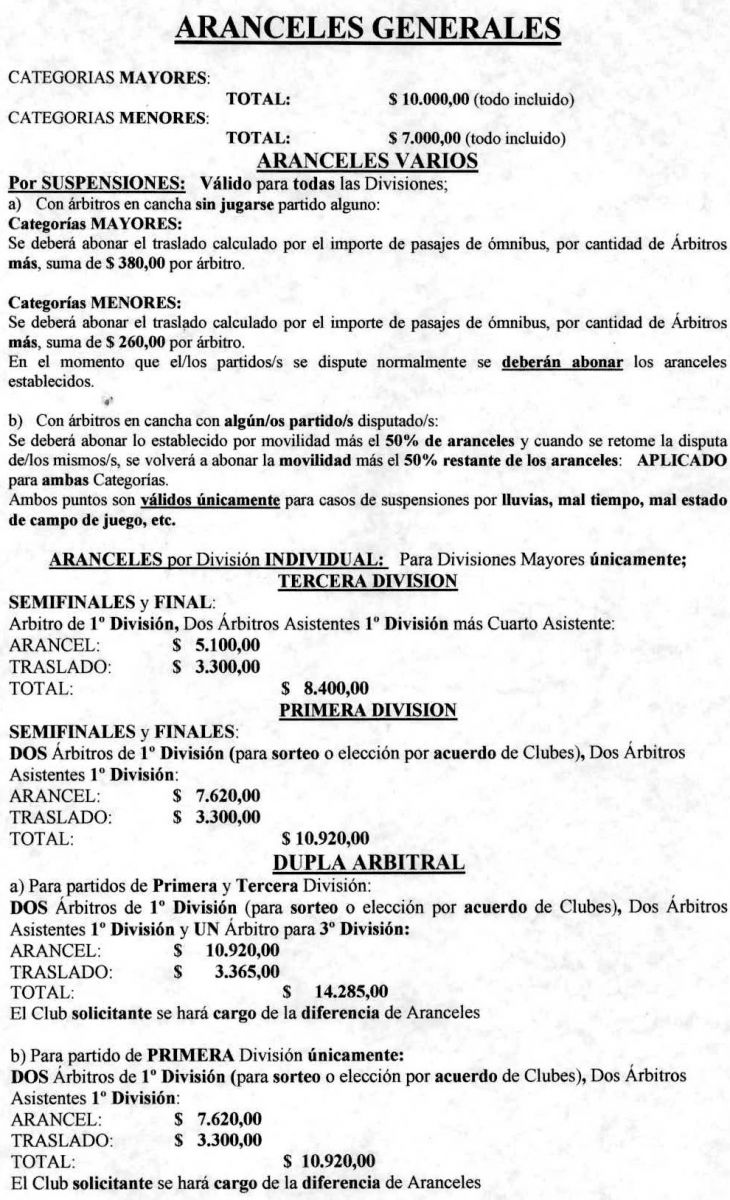 Se adjunta los distintos aranceles que deben abonarse a los árbitros designados en los distintos casos de posibles suspensiones de partidos: