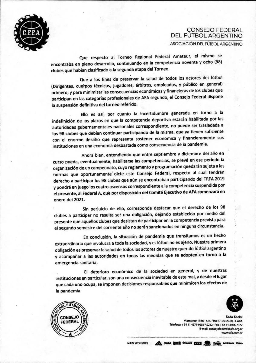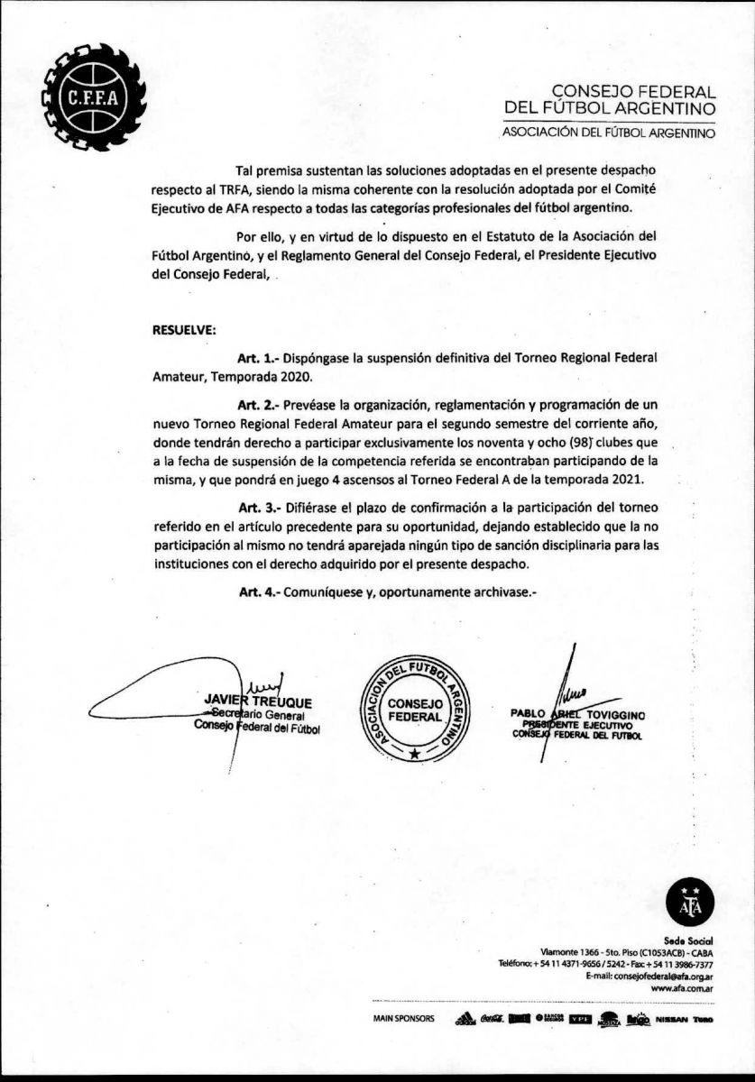 En estos días hemos recibido de manera oficial la comunicación de parte del Consejo Federal del Fútbol Argentino respecto a la resolución publicada el día 23.04.2020. El Despacho 12556 expresaba lo siguiente: