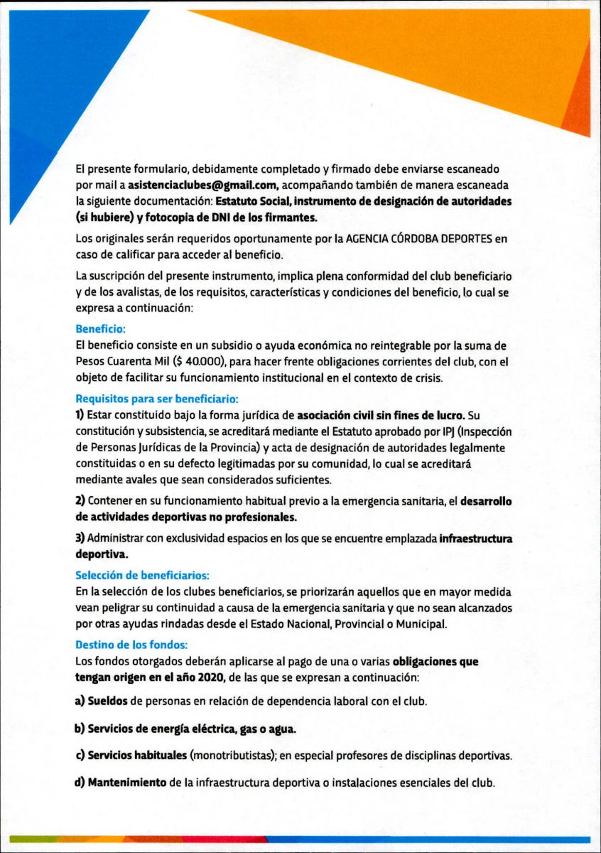 Tan como lo publicáramos el dia de ayer, la Agencia Córdoba Deportes lanzó un PROGRAMA DE ASISTENCIA ECONÓMICA A CLUBES, el cual consta de la entrega de un subsidio de $ 40.000,00 para clubes de nuestra provincia.