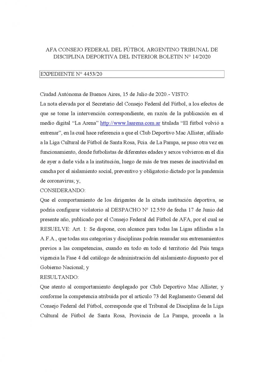 El Consejo Federal del Fútbol Argentino emitió en el día de ayer un fuerte comunicado mediante EXPEDIENTE N° 4453/20, en el cual se expone la violación de lo dispuesto por esa institución respecto a la cuarentena y a la vuelta a la actividad deportiva en los clubes afiliados a A.F.A.