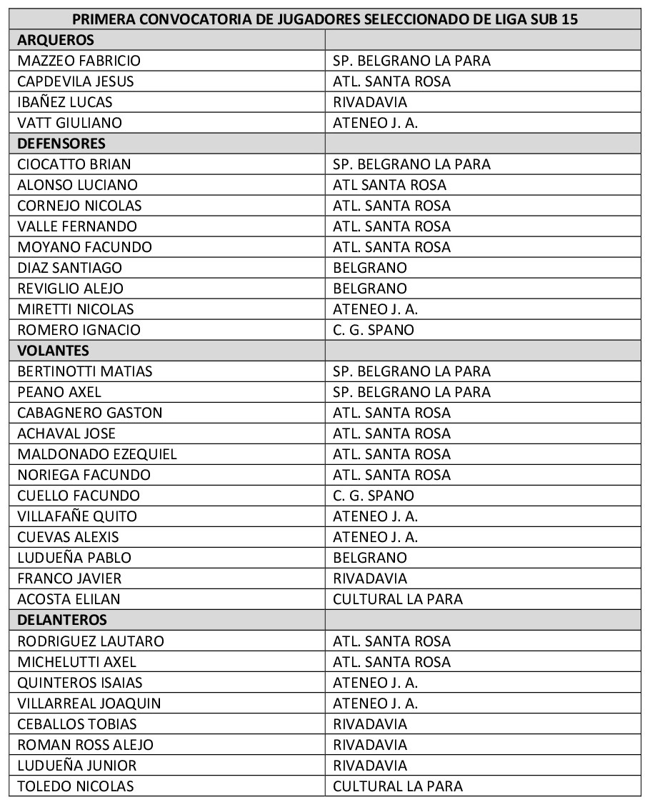En el marco de los preparativos para la participación de nuestra Liga Regional de Fútbol San Francisco en el campeonato provincial de selecciones Sub 13 y Sub 15 organizado por la Federación Cordobesa de Fútbol, el cuerpo técnico del club Atlético Santa Rosa designado por mérito deportivo para la conducción de nuestro seleccionado sub 15, realizó la primer convocatoria de jugadores de la zona noroeste, a la cual pertenece el derecho de participar en el presente año de acuerdo a los establecido por el Comité Ejecutivo. El listado de jugadores es el siguiente: #LigaRFSanFrancisco