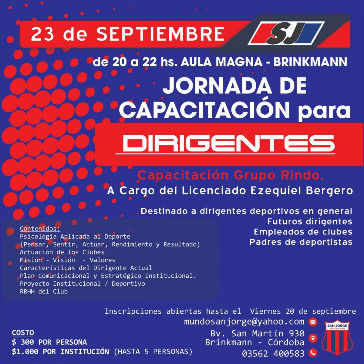 El club Fundación San Jorge organiza para el próximo lunes 23 de septiembre una jornada de capacitación para dirigentes, por lo que los hace extensiva la invitación a todos los clubes afiliados a nuestra institución.