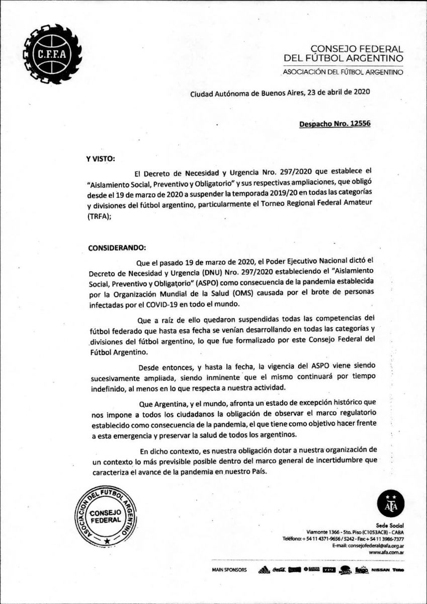En estos días hemos recibido de manera oficial la comunicación de parte del Consejo Federal del Fútbol Argentino respecto a la resolución publicada el día 23.04.2020. El Despacho 12556 expresaba lo siguiente: