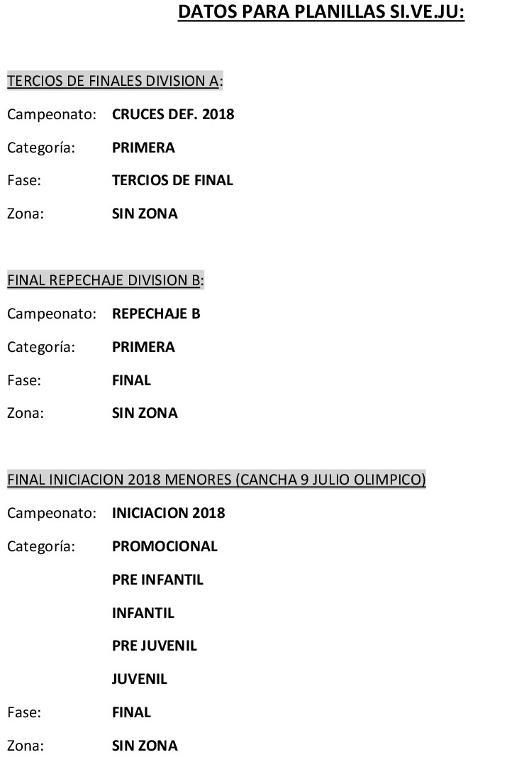 A continuación informamos los datos que cada planillero deberá ingresar en los partidos que se disputen por TERCIOS DE FINAL DIVISION A, FINAL REPECHAJE DIVISION B Y FINALES TORNEO INICIACION 2018 DE CATEGORÍAS MENORES.