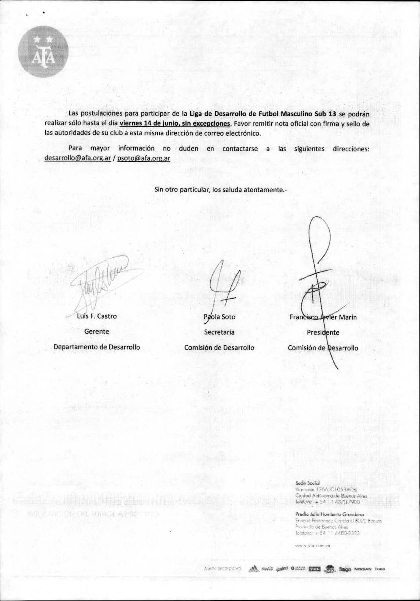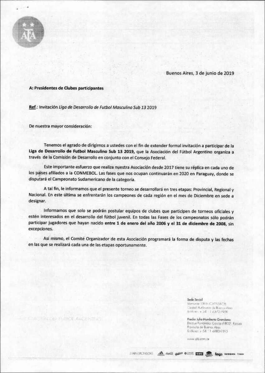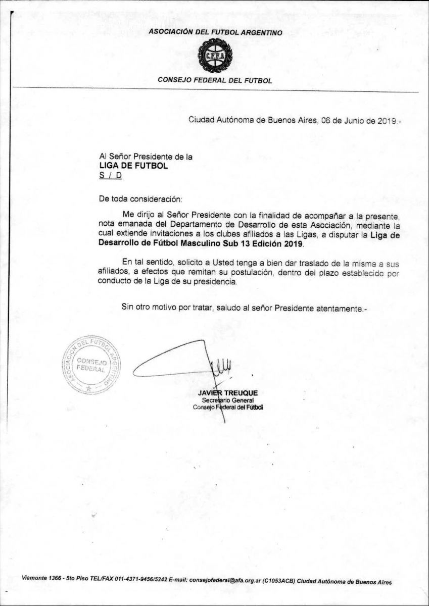 En el día de ayer hermos recibido la invitación del Consejo Federal del Fútbol Argentino para todos nuestros clunes afiliados a participar de la Liga de Desarrollo de Fútbol Masculino Sub 13 Edición 2019.