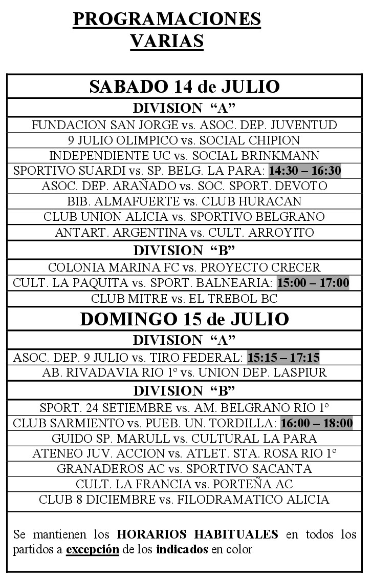 Adjuntamos el programa de partidos para el fin de semana del 14 y 15 de julio del corriente año.
