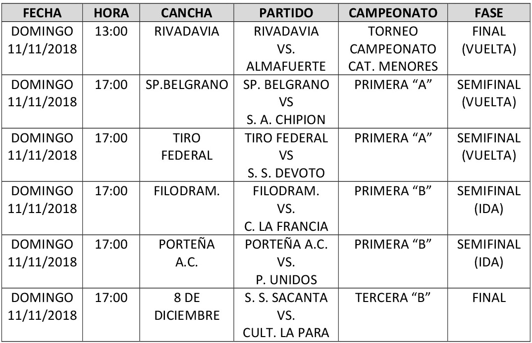 El próximo día domingo 11 de noviembre se llevará acabo la disputa de los partidos de los cruces finales de las categorías menores y mayores de nuestra Liga. El programa de partidos es el siguiente: