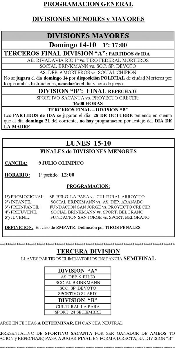 Quedó establecido el programa de partidos a disputar el próximo fin de semana en las categorías mayores y menores de nuestra Liga y el mismo es el siguiente: