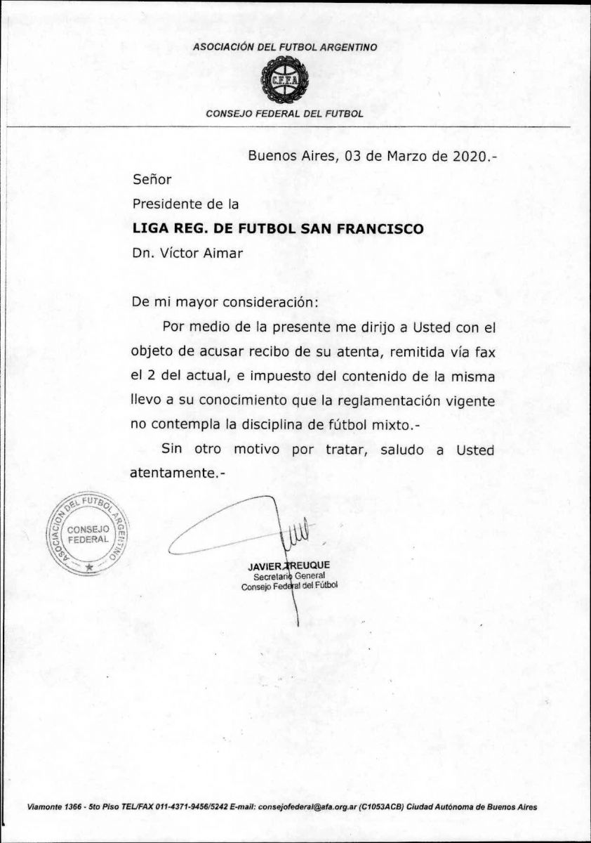 Luego de volver a realizar las consultas telefónicas respecto a la posibilidad de realizar fútbol mixto en nuestros campeonatos oficiales, ésta Liga realizó nuevamente las mismas en forma escrita, recibiendo en el día de ayer la respuesta al tema en cuestión, definiendo el Consejo Federal del Fútbol Argentino, QUE LA REGLAMENTACIÓN VIGENTE NO CONTEMPLA LA DISCIPLINA DE FÚTBOL MIXTO.