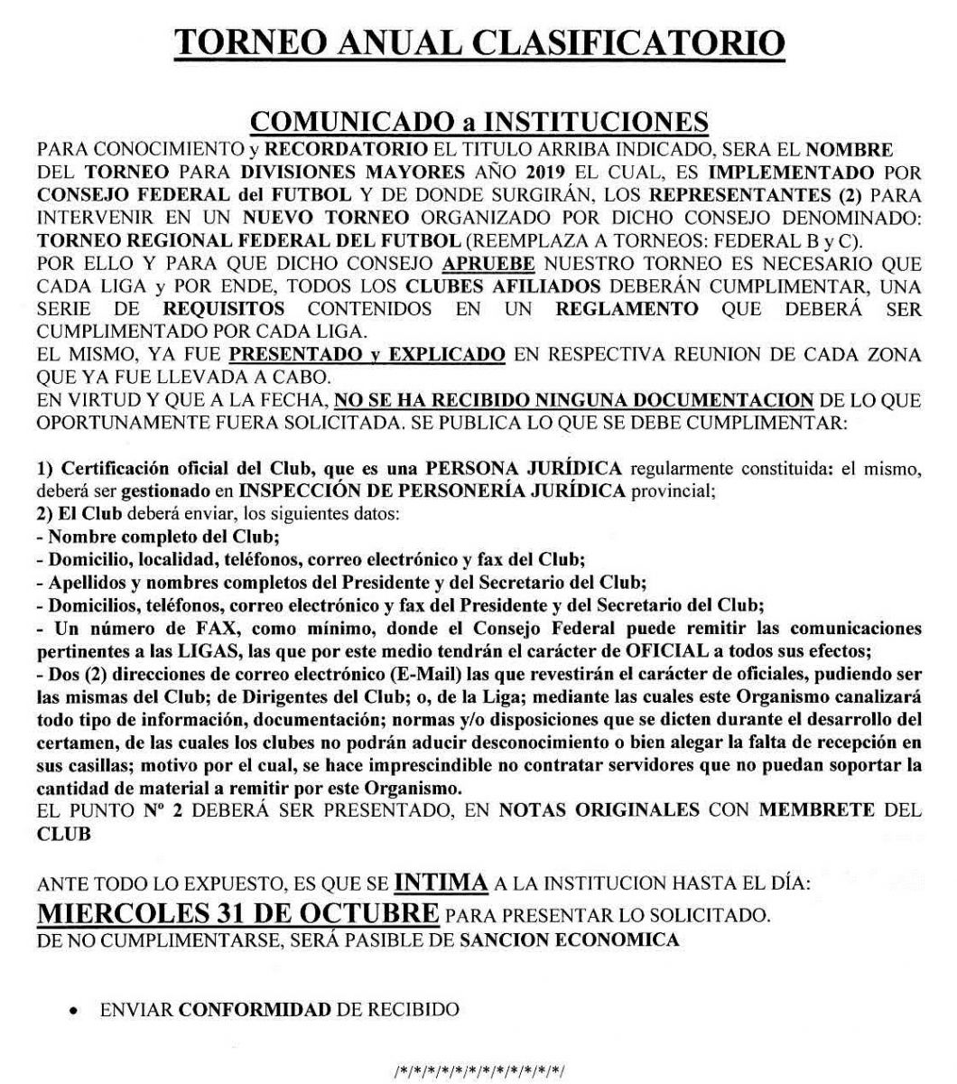 Adjuntamos comunicado respecto a condiciones y pedidos realizados oportunamente a los clubes para la participación en el Torneo Anual Clasificatorio año 2019.